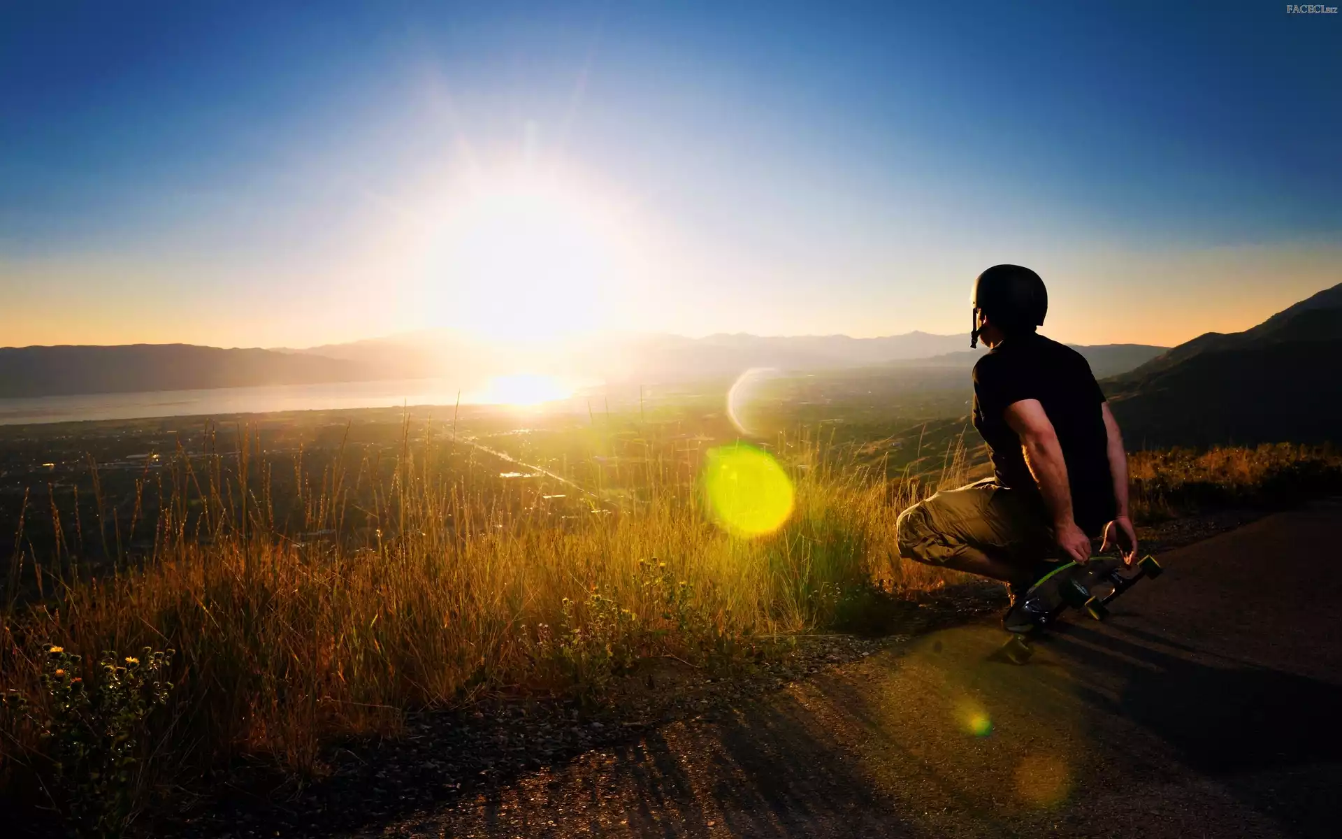 Jezioro, Promienie, Deskorolka, Mężczyzna, Słońca, Łąki - faceci.biz