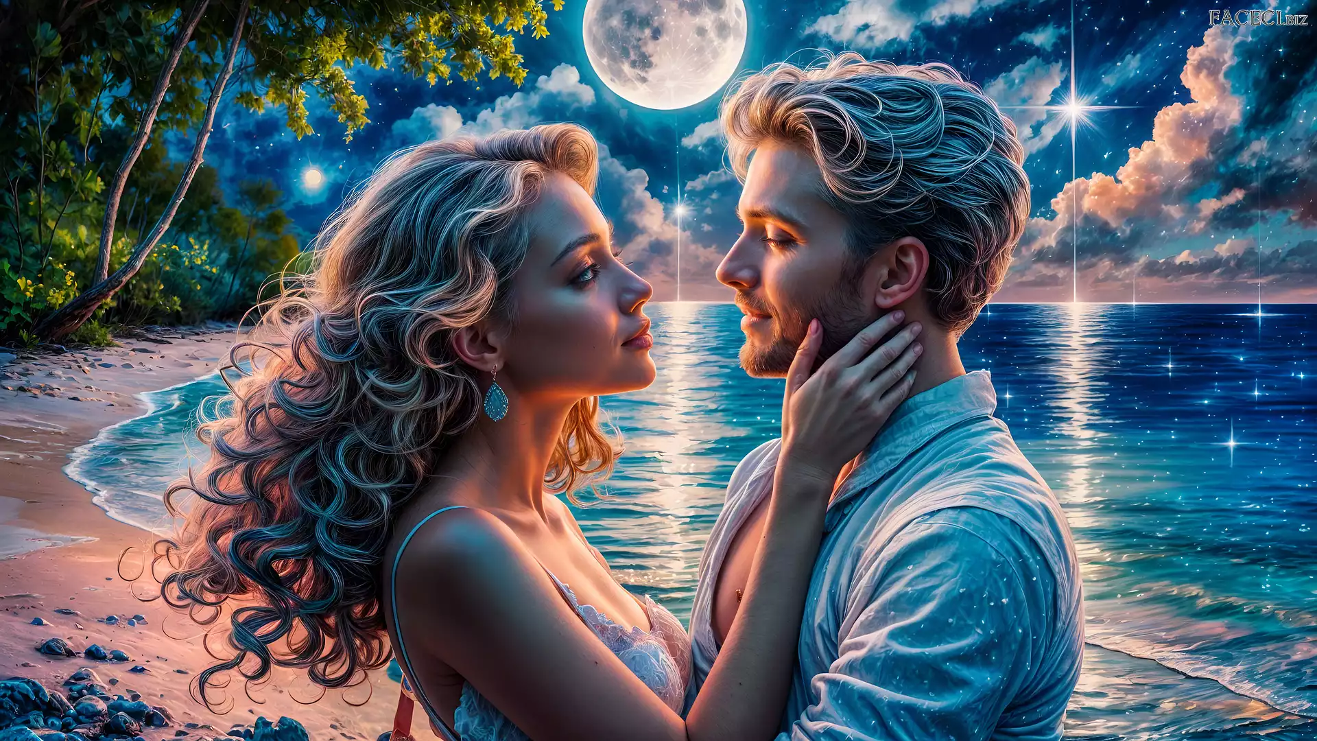 Księżyc, Morze, Gwiazdy, Kobieta, Grafika, Mężczyzna, Zakochani, Para - faceci.biz